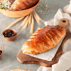Crocante por fora, com miolo macio e produzido a partir de uma fermentação lenta. Combina com vários tipos de antepastos, conservas, patês, mousses e terrine.